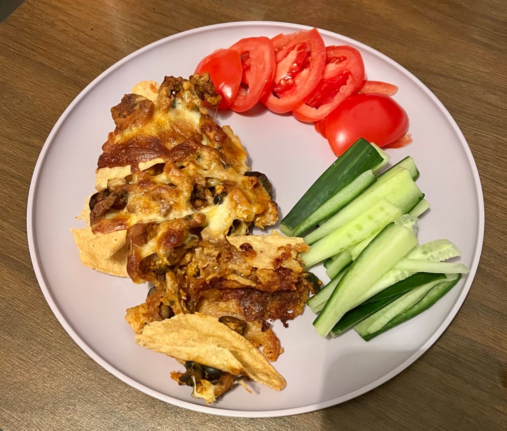 Cover any leftovers with foil or wrap and put into the fridge. Aim to eat them the next day or the day after at the latest. I find the leftovers best served cold but if you want to reheat them try find the time to do it in a low temperature oven, add a little more cheese and keep a careful eye on the chips or they get the bad chewy really quickly.