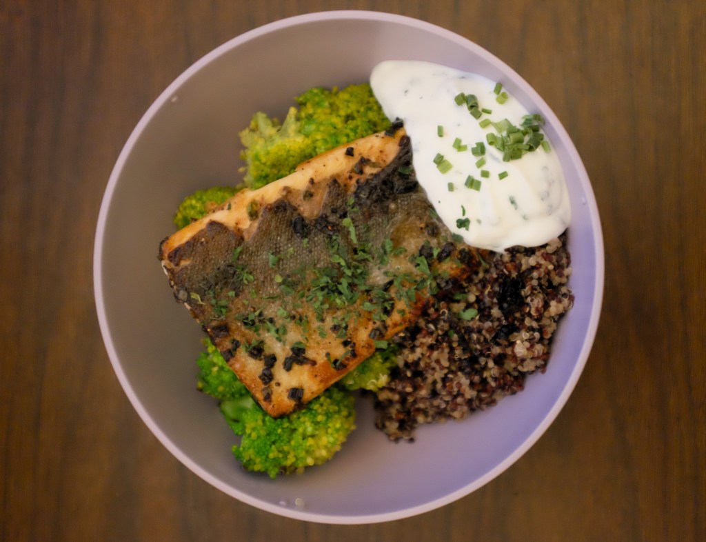 - Serve the quinoa and broccoli, add the salmon and finally the yoghurt