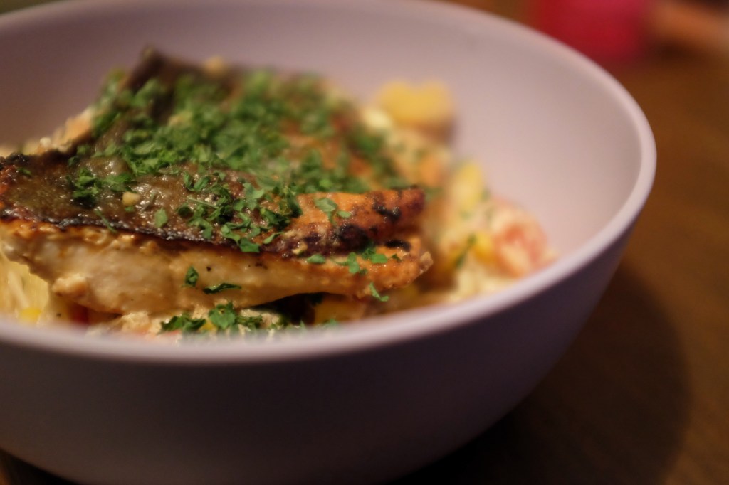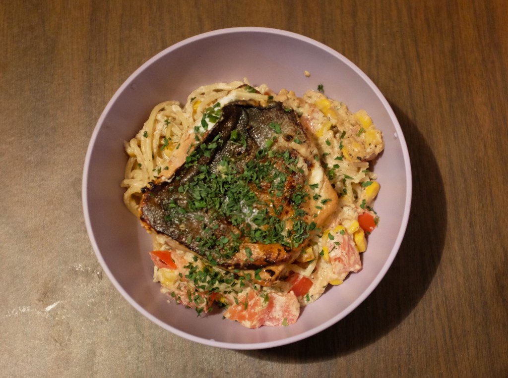 The first is served with quinoa, broccoli and a Greek yoghurt dip/sauce and the second is done with tomato, corn and a creamy sauce spaghetti.