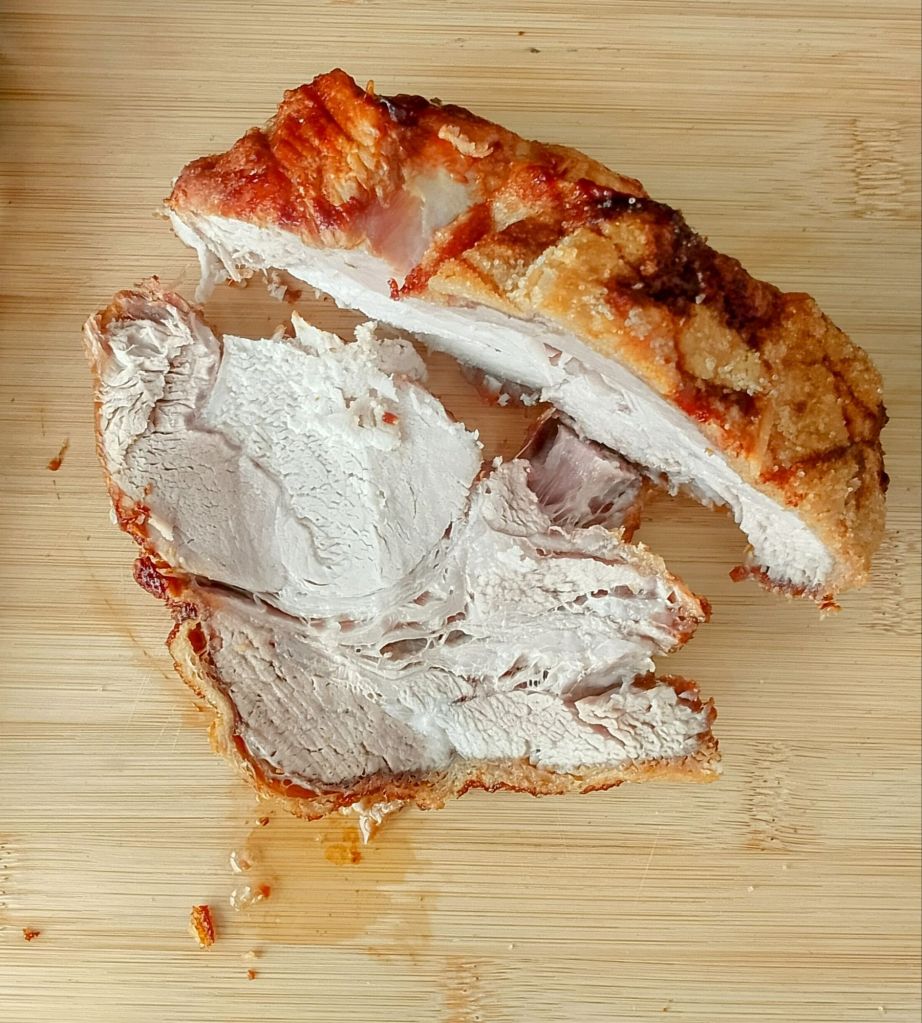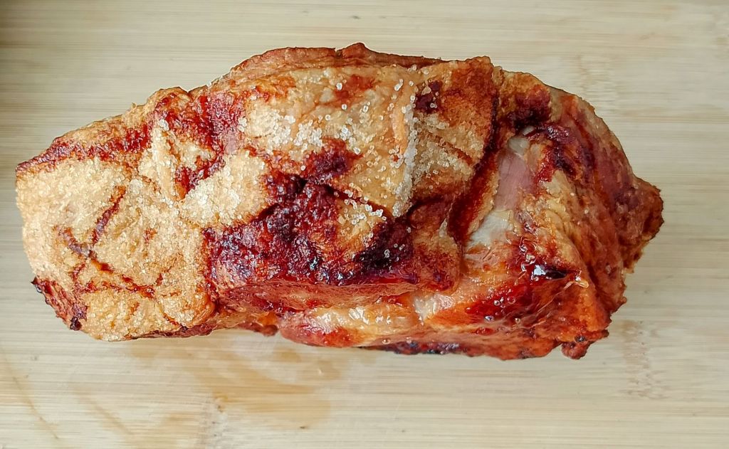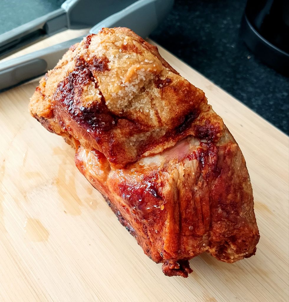 - Cook for approximately an hour and ten minutes, checking it after one hour, but remember that the joint tends to shorten in length and increase in height so make sure it has enough room to be able to cook without catching on the top of the machine. If you check on it and find it has changed shape too much lay it flat and turn it over later to give more of the edges an even colour but this might mean you need to pull the skin off and put it back into the airfryer for longer to let it crisp up
