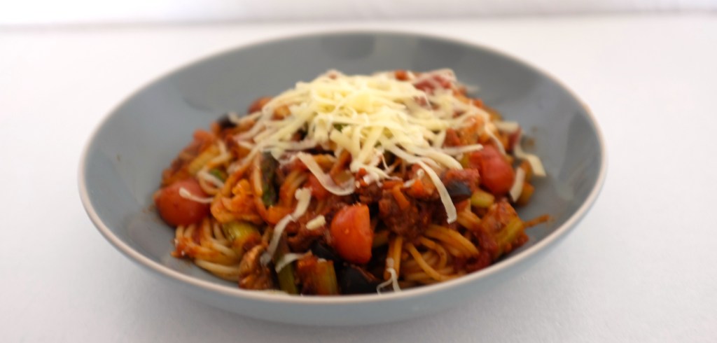 This can very easily be moved to Tupperware and the rest had a day or two later or you could even freeze this and have it next month. If you are doing this move the mixture of vegetables and meat into the tupperware first before you mix the spaghetti through. This always you to be a bit more versatile with your leftovers and, this is a personal preference, but having to add extra liquid to stop spaghetti drying out during reheating is a risky game.
