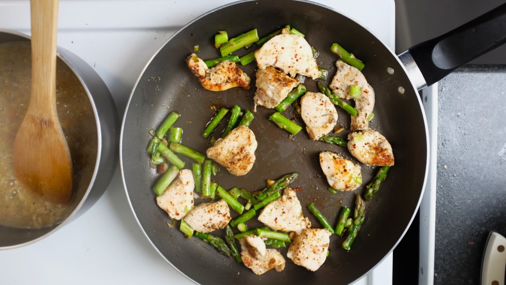 - When the chicken is just cooked add the seasonings and spring onion to the pan and after a couple of minutes add the asparagus for a couple more minutes before removing it from the heat