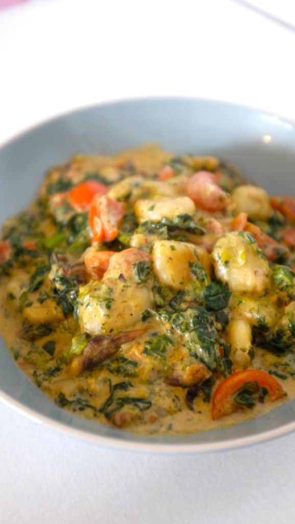 - After a couple of minutes add in a bit of butter and the gnocchi and allow this to start crisping on the outside