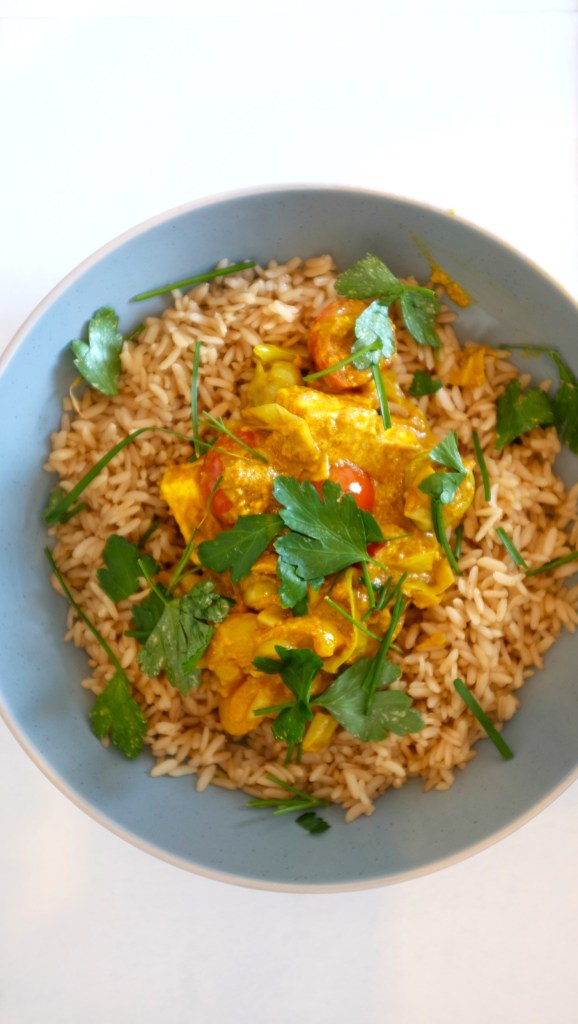 - Get your rice ready and after the curry has been simmering for that time serve everything up. Top with flat leaf parsley and garlic chives if they’re available to you