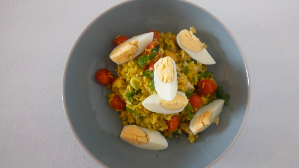- Put 50g dried long grain rice with about 1.5 ratio of water, some salt, black pepper and mild curry powder and put it on to boil