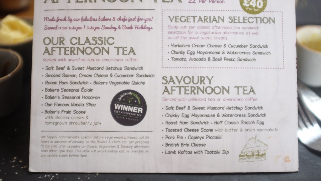 Farmer Copley’s Afternoon Tea and Savoury Afternoon Tea is £22 Per Person (or two for £40 after 3pm).
