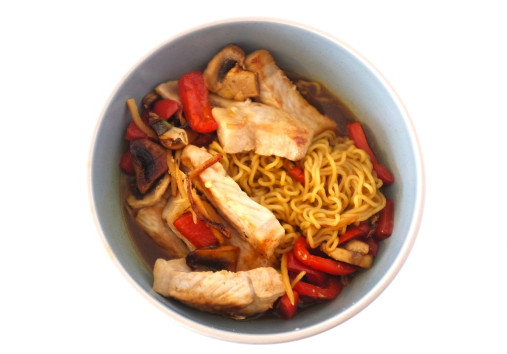 - After checking the pork is cooked serve the noodles in a bowl and top with the pork mixture. Alternatively mix it all together and serve that way (chop the pork smaller if this is your serving choice)
