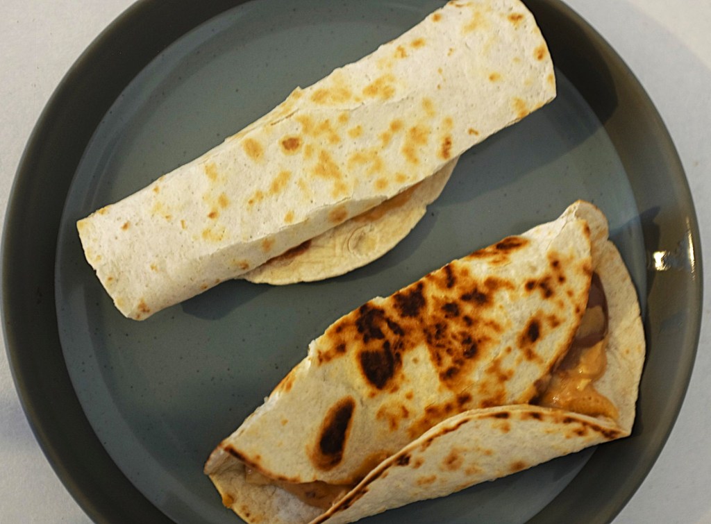 - Spread peanut butter across a tortilla whilst it is off the heat