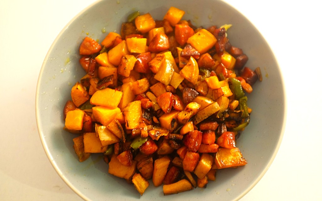 I tried to use a green bell pepper to contrast the redder and more orange shades of the chorizo, carrot and sweet potato but if you still want to make it more varied colours you could add some courgette or even some quartered pan-fried sprout too.