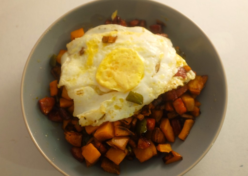 If you want to try to reduce the fat and oil content, especially from what comes out of the chorizo, you can always dab the pan down a little bit before serving and choose a different method of cooking your fried eggs. Chorizo is naturally pretty high in fat but some is higher fat content than others so if this is something you want to keep an eye on then compare the ingredients and contents when buying them! I went for probably a double serving of chorizo so you can easily half this to about 75g per portion and just add in extra vegetables.