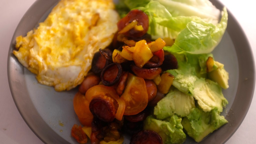 If you don’t want the fried eggs you could easily opt for scrambled egg or boiled eggs on the side instead. You could also omit them completely, especially if sticking with 125g of chorizo but you could also drop the chorizo or some of the avocado to feel better about having the egg too. I had plenty of macro allowances left for the day so wanted to try have a meal that was largely far less processed foods.