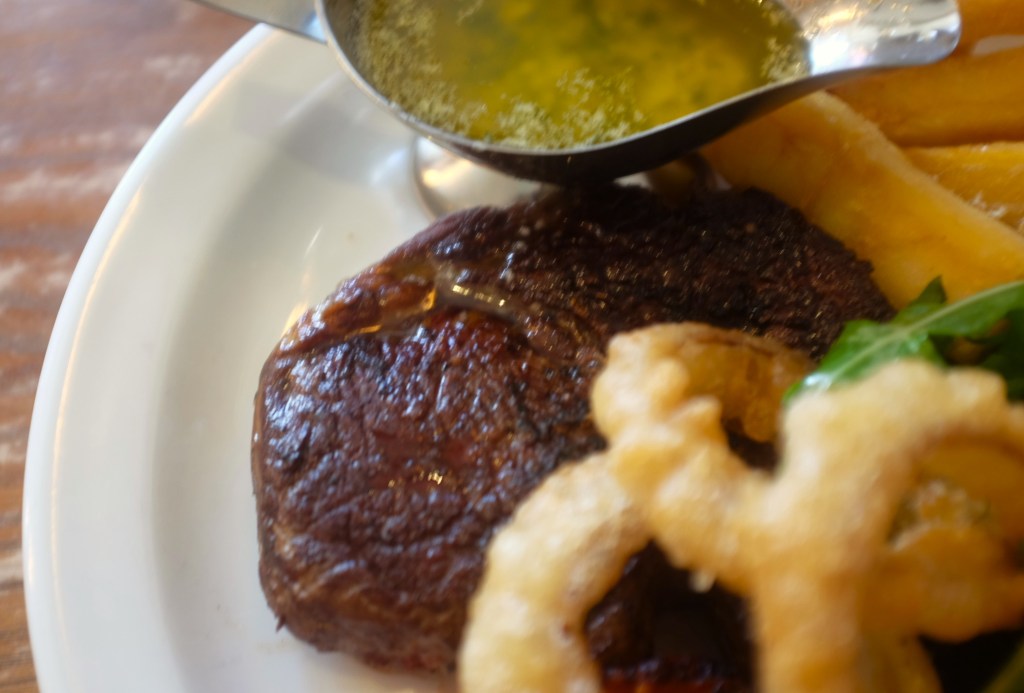 After pondering their delightful range of options on their menu for a while I went for the 10oz rib-eye that came with a large mushroom, a super chunky half tomato, onion rings, chunky chips, some salad and the most incredible garlic butter sauce.