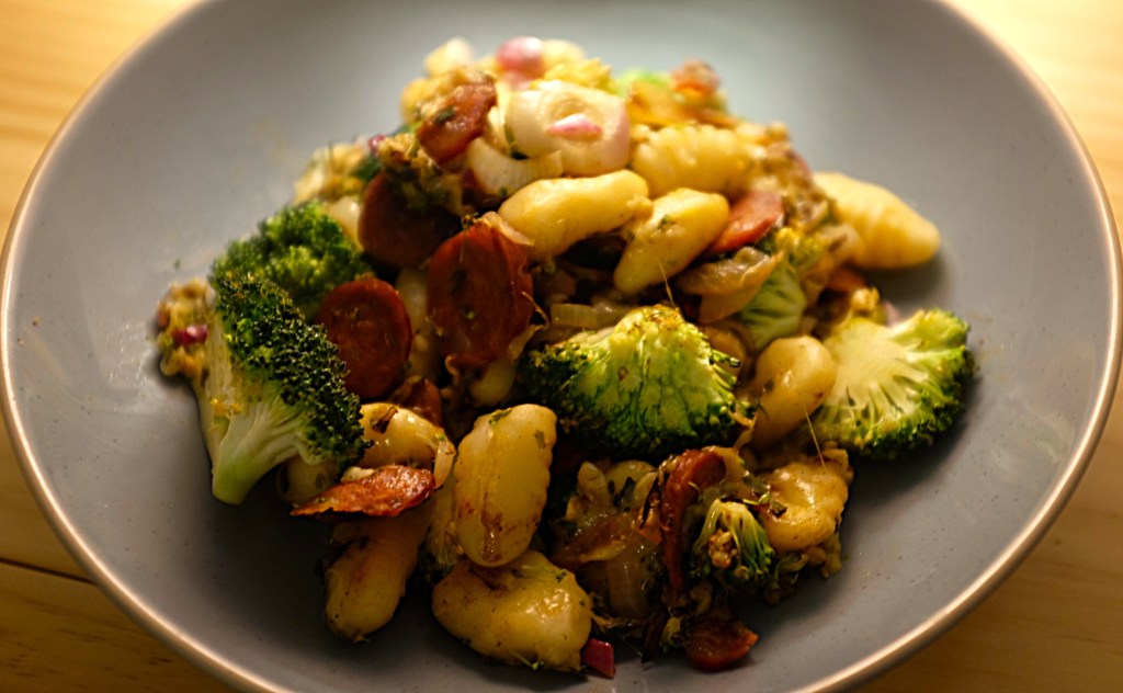 It also works incredibly well being stored and eaten the next day. It’s best if you can airfry or pan fry it again but if you put it in a well vented container in the microwave so that the steam doesn’t turn the gnocchi to much then that will work okay as well.