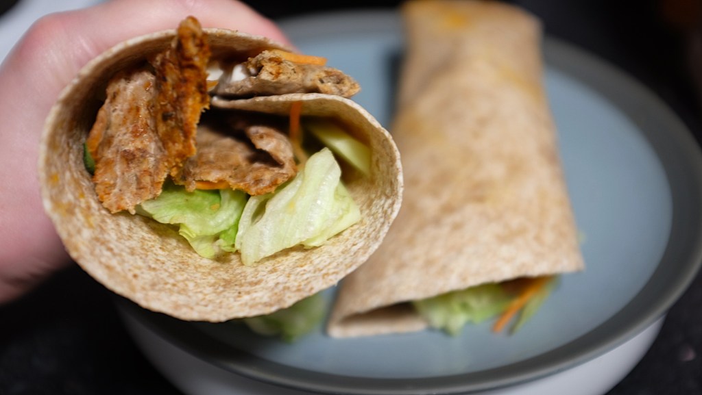 It will also work pretty well reheated in the microwave too as the steam will stop it from drying up and crumbling too much but you could reheat strips of it in a frying pan if you wanted too. Just obviously hold putting it in the bread or with salad until you’re ready to eat!