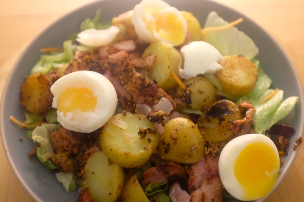 - Place the bacon, shallot and potato mixture on top of the salad and top with the eggs