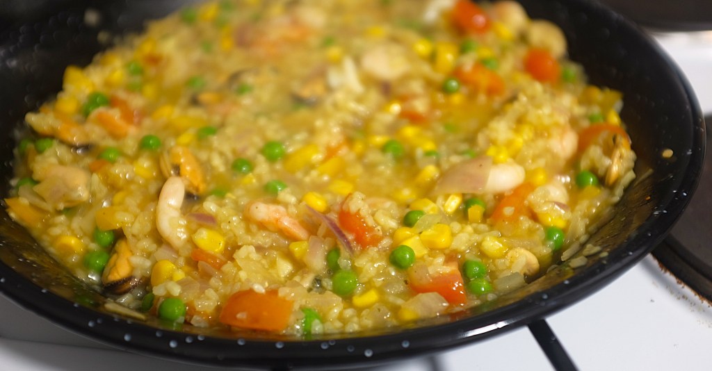 I just put a basic seafood selection in here of mussels, prawns and squid rings but you could absolutely add chicken and chorizo or other seafood things as well. If you want to make it more fancy you can absolutely do it completely fresh and even present it with things like the shells still as well.