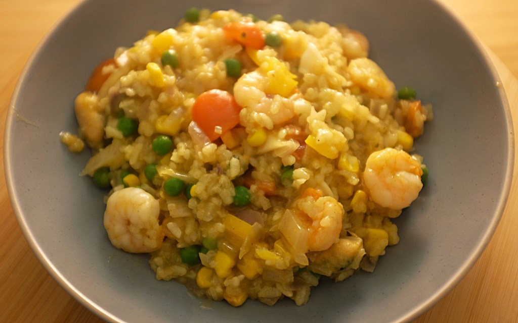 - Add peas, sweetcorn and baby plum tomatoes as well as a little more stock. Be sure to just let it cook without stirring too much or too often