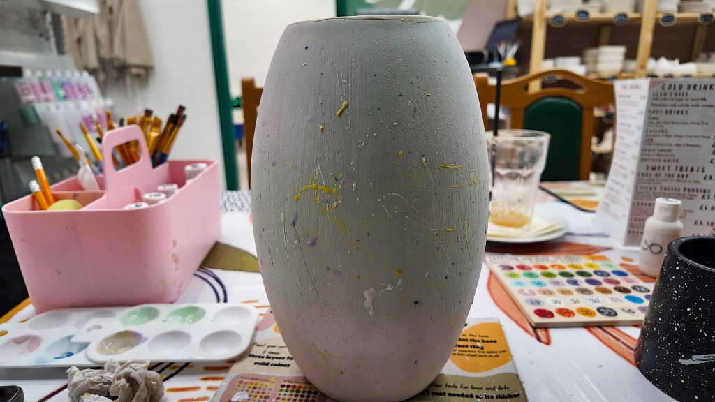 I went in with a plan; A pastel ombre with some splatters on it and I think I ended up managing to pull it off fairly well. The thing you have to remember, and it’s why they have the tile for reference, is that it takes three layers of paint to make it a solid colour but also that the dried/kiln colour will be slightly different to how it appears in the paint tub.